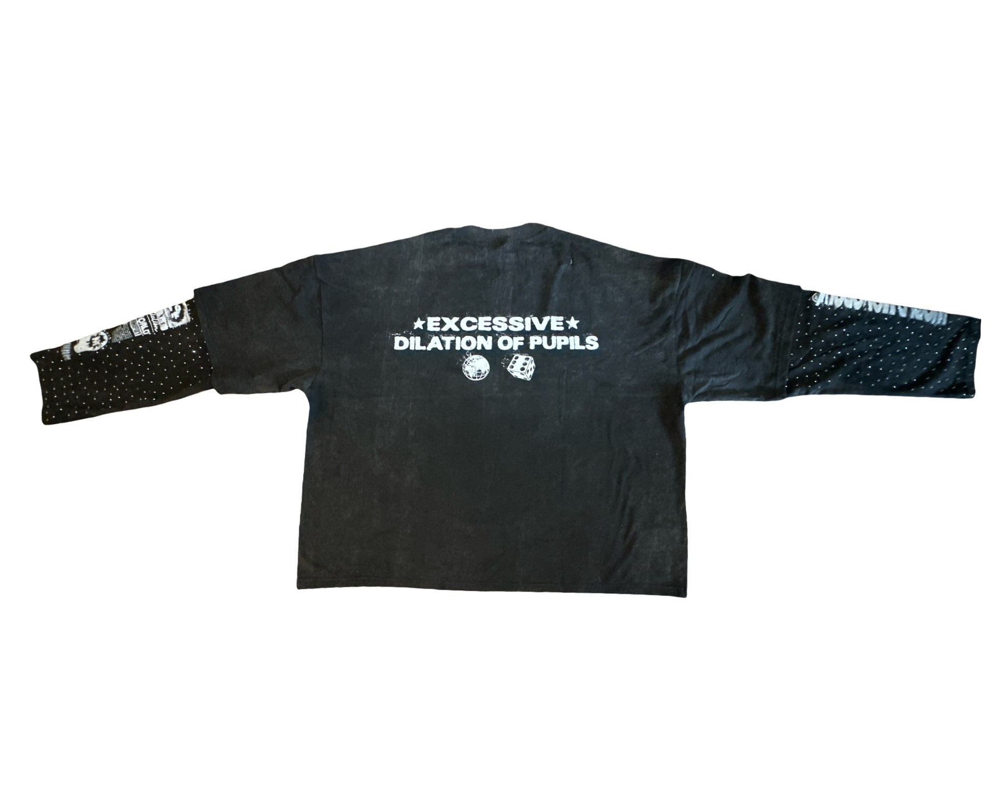 Make a statement that shines—literally. This black long sleeve shirt features the bold message "Stay Away from Meth", paired with rhinestone detailing along the sleeves for a look that's both eye-catching and meaningful.